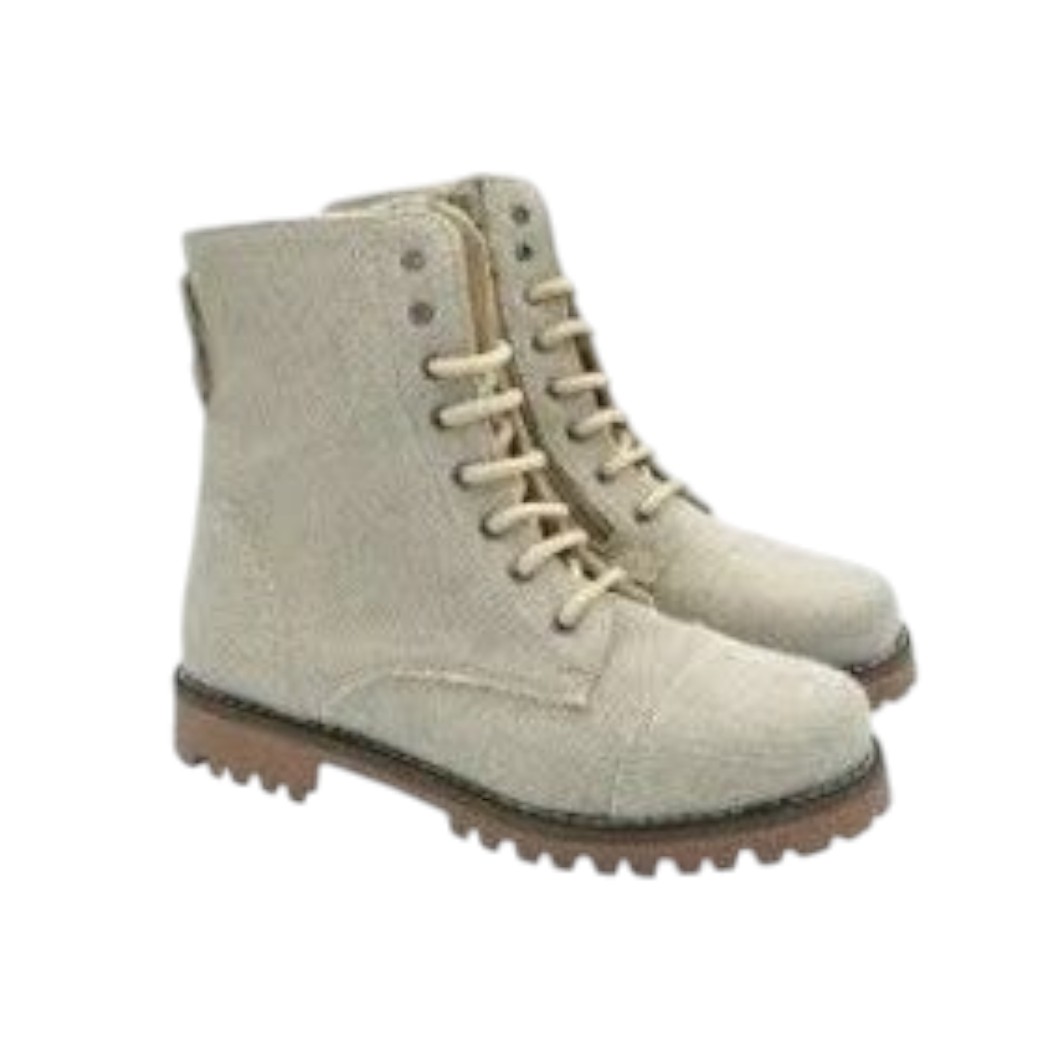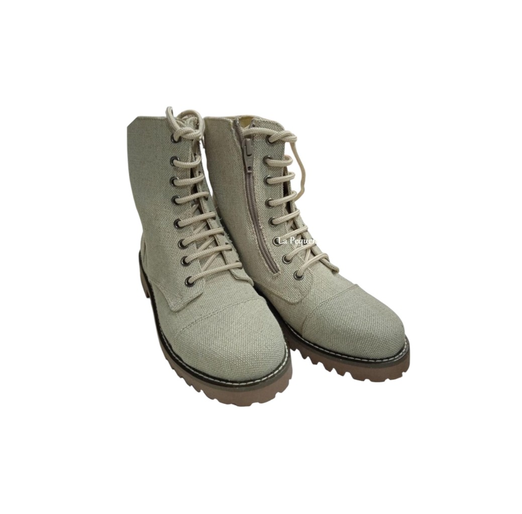 Botas de lino para niño son ideales para eventos especiales y celebraciones como comuniones. Su diseño elegante en color beige, combinado con el estilo militar de los cordones y la funcionalidad de la cremallera lateral, las convierte en una opción sofisticada y práctica.