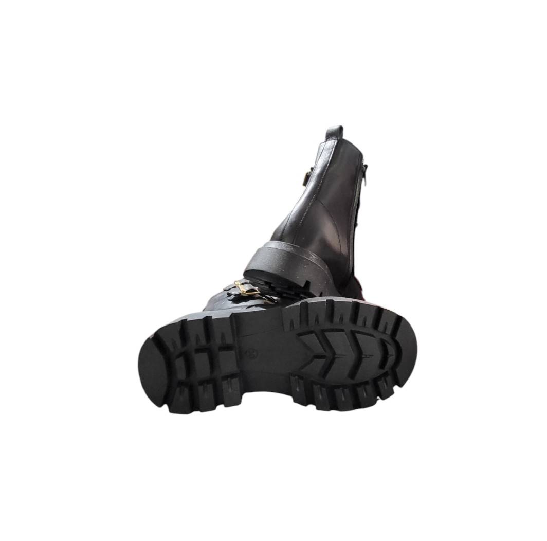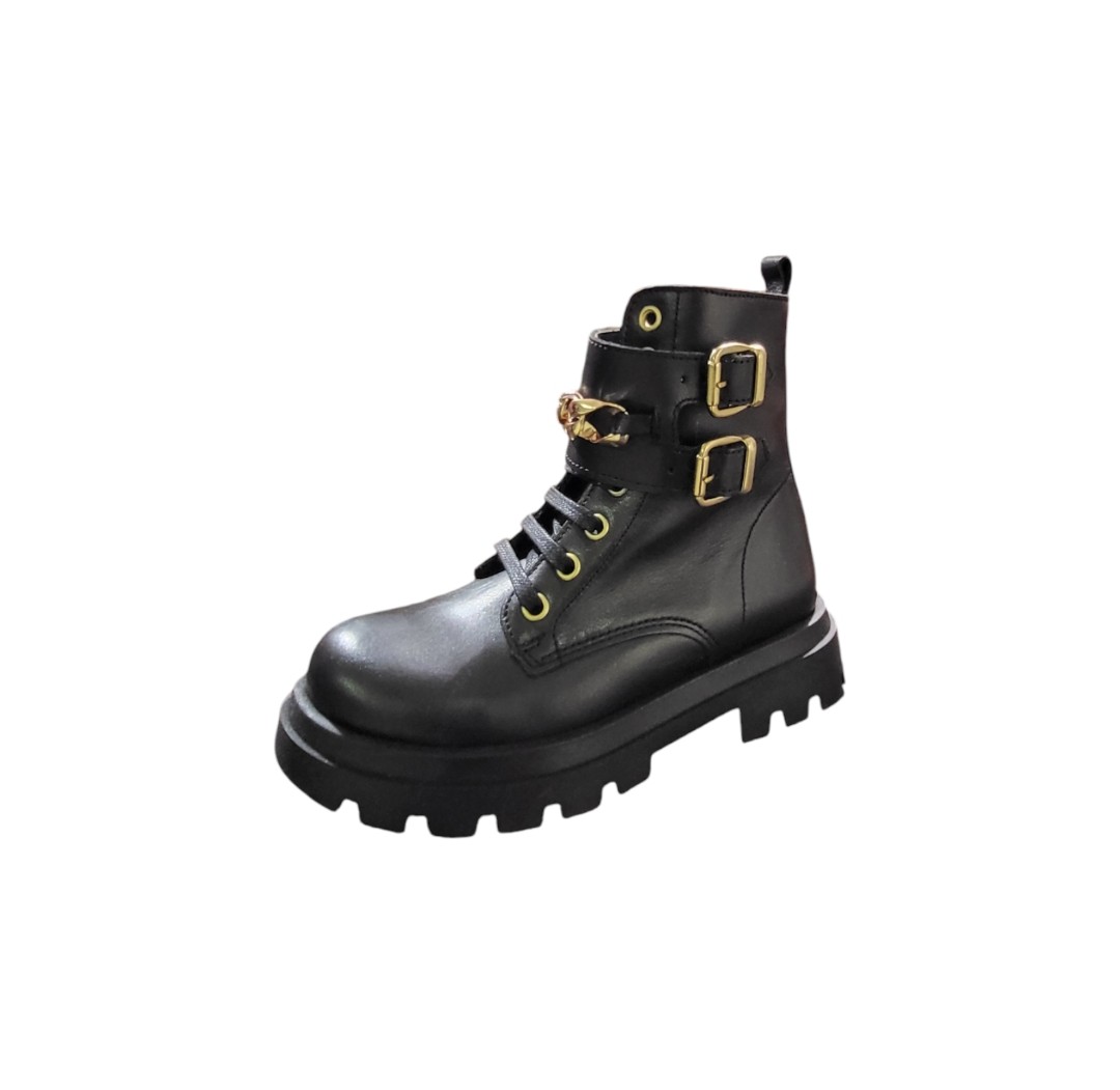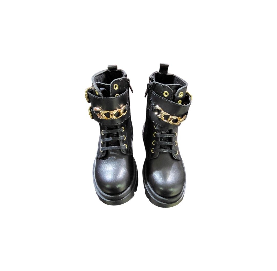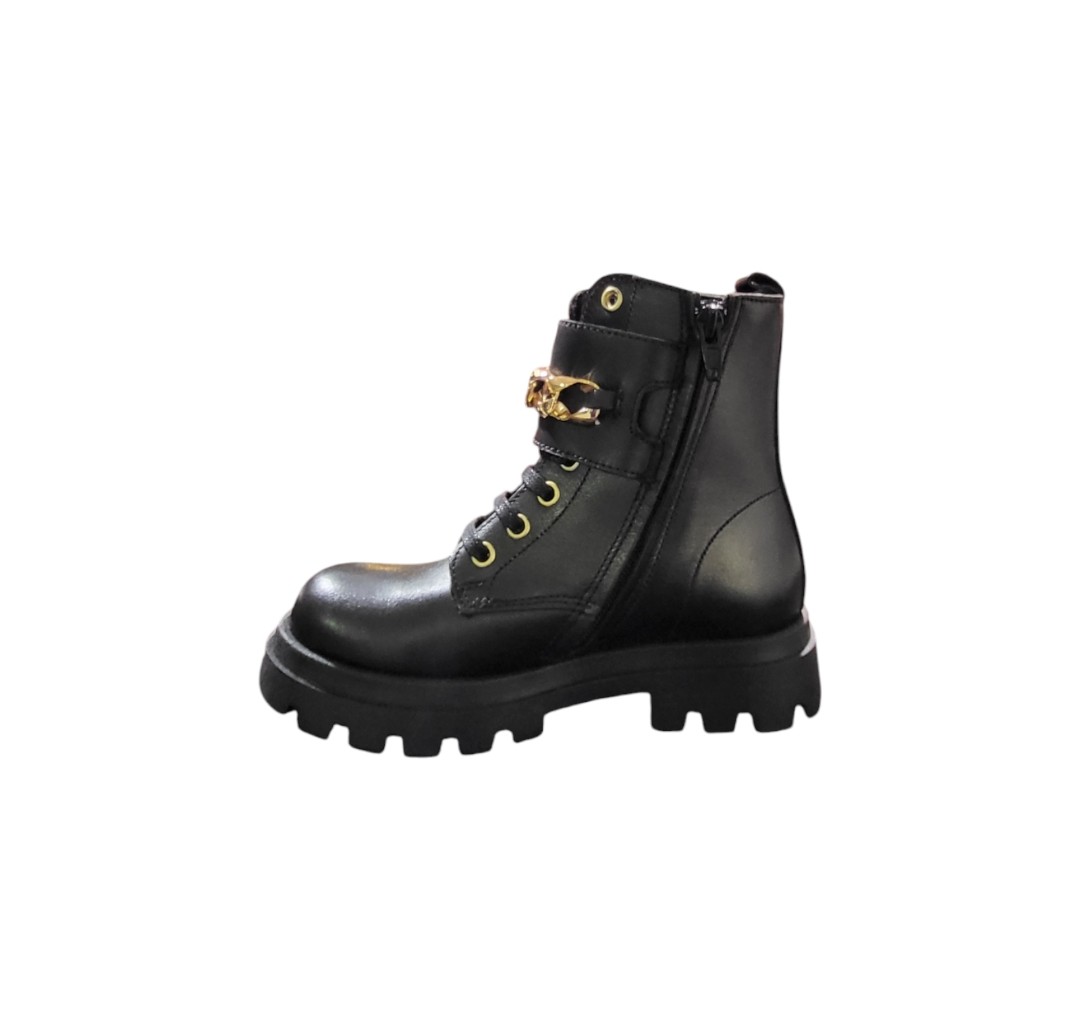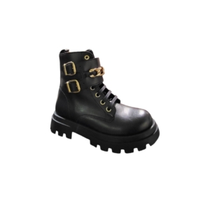 La bota de confetti es un calzado infantil diseñado para ofrecer comodidad y estilo a los más pequeños. Fabricada con piel napa de alta calidad, esta bota es suave y flexible, permitiendo un movimiento natural del pie. La suela es gruesa y dentada, proporcionando una excelente tracción y durabilidad. La bota presenta dos correas con hebillas doradas y un adorno dorado en la parte delantera, añadiendo un toque elegante y moderno. Los ojales dorados para los cordones complementan el diseño, que es ideal tanto para un look casual como urbano.