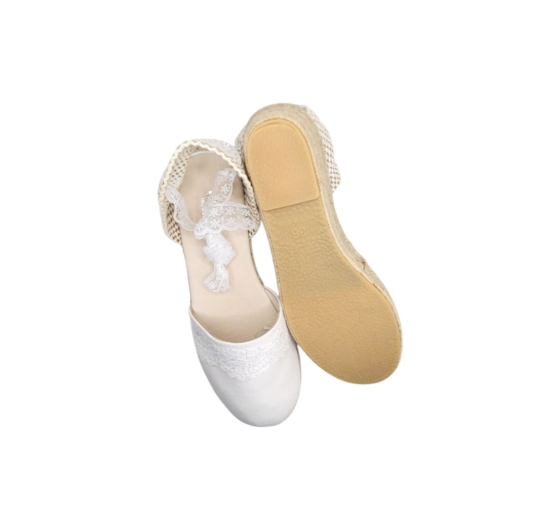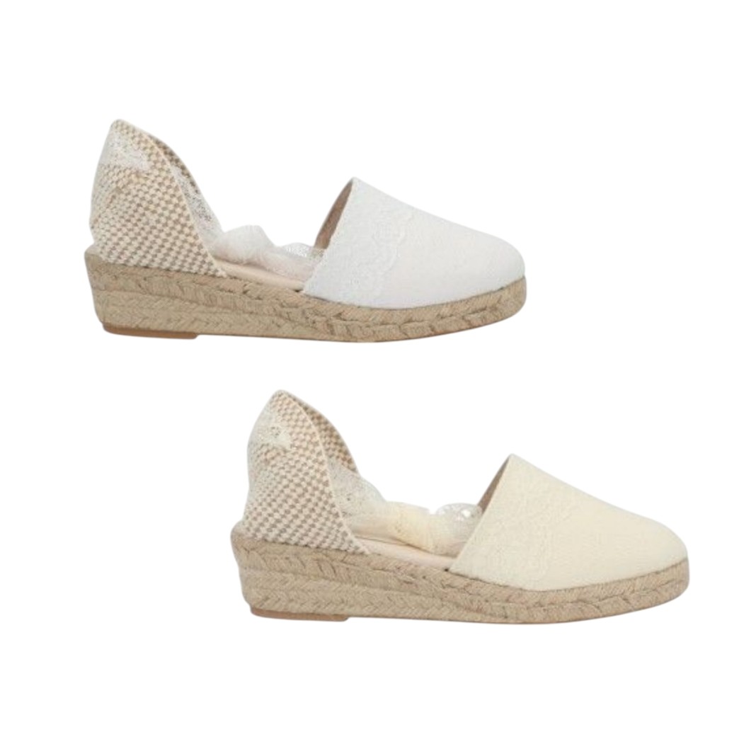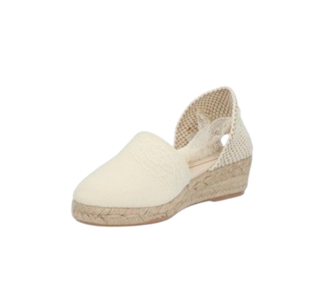 - Suela: de esparto trenzado con un ligero tacón, proporcionando comodidad y estabilidad.