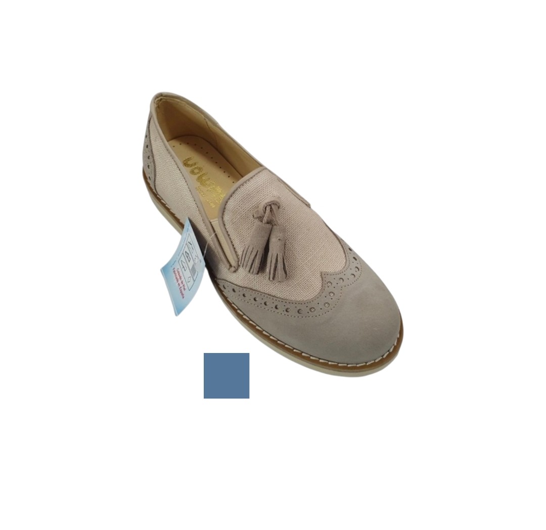 Mocasín serraje borlas niño y lino para comuniones y ceremonias. Un zapato moderno y cómodo .Fabricado en serraje natural y lino.