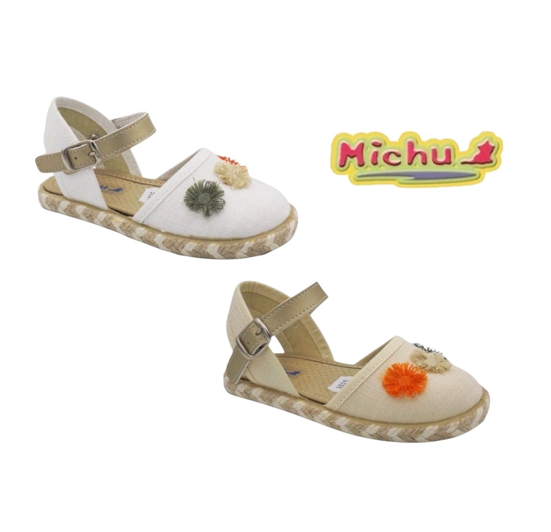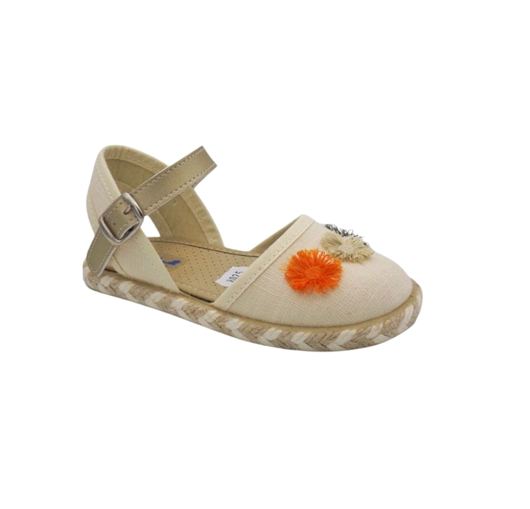 Estas espardeñas infantiles de la marca Michu combinan comodidad y estilo artesanal. Disponibles en blanco y beige, cuentan con una suela de esparto trenzado que aporta un toque tradicional. Su correa ajustable en tono beige con hebilla metálica garantiza un ajuste seguro y cómodo para los más pequeños. La parte superior está decorada con tres pompones en colores verde, crema y naranja, añadiendo un detalle divertido y original.